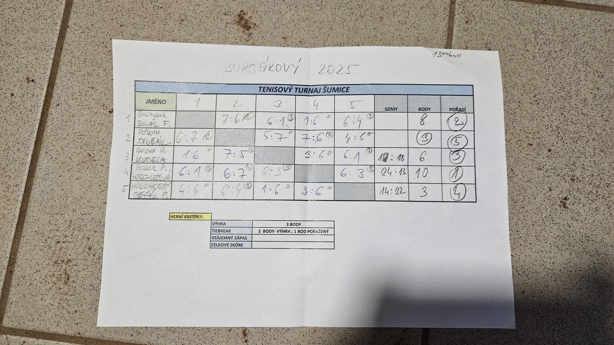 V sobotu 4.10. jsme pořádali oddílový losovaný turnaj ve čtyřhře. Pět nasazených hráčů si vylosovali spoluhráče a systémem každý s každým si zahráli vždy jeden set. Jak už název turnaje napovídá, hlavním občerstvením byl burčák bílý i červený.